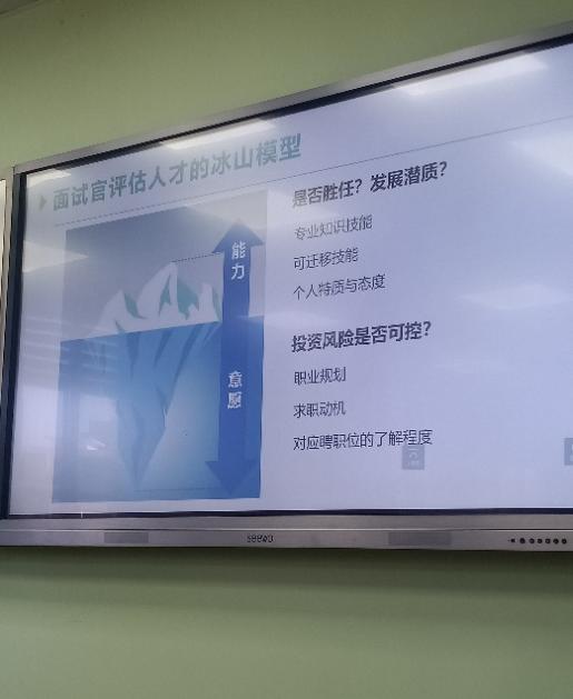 第二部分中,主讲人向员工们介绍了面试官评估人才的冰山模型,讲解了六种面试类型、面试礼仪与形象管理以及如何利用3W原则来让自我介绍与众不同。同时,主讲人还为同学们展示了各类面试问题示例,分享了破题思路。