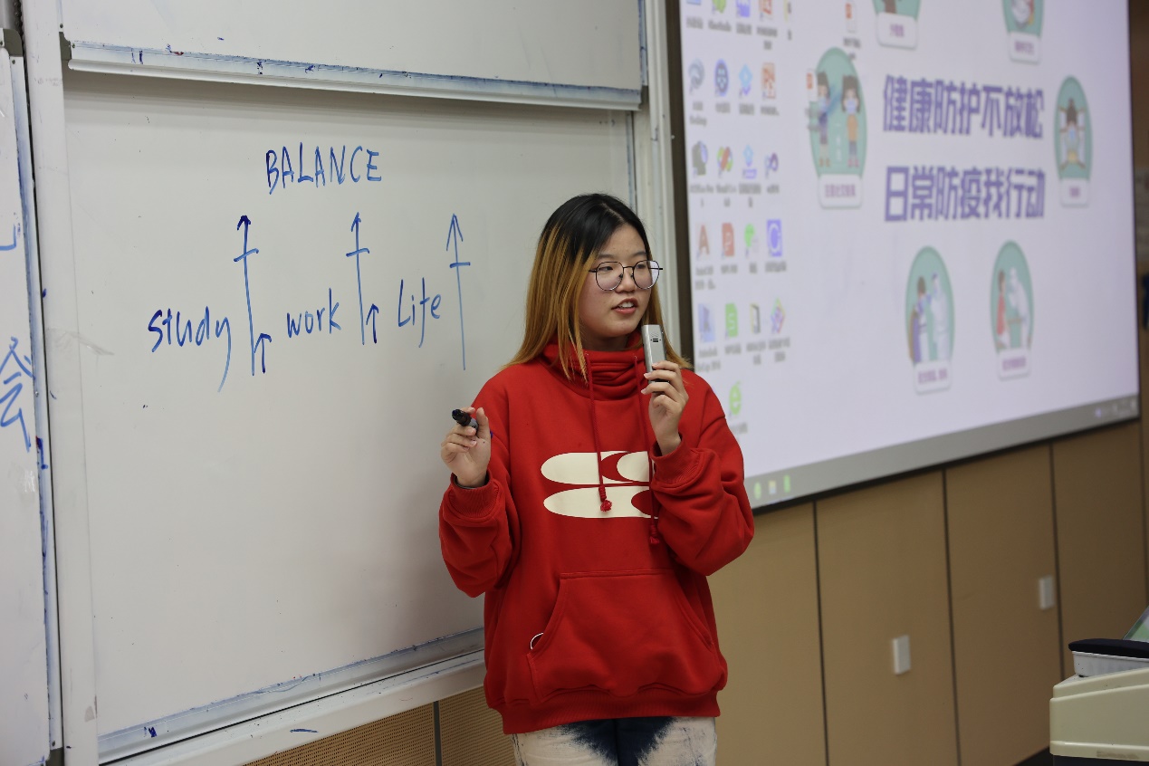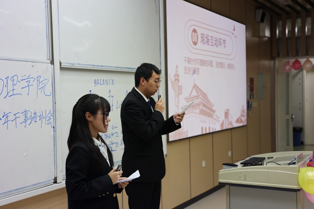 接下来,员工会办公室部长杜政远对干事们进行员工活动经费的报账培训,社团工作部部长陈子豪为大家介绍教室申请和青广申请流程。学院员工会副主席张馨予也就“如何平衡学习、员工工作和生活”与同学们进行了分享和互动。