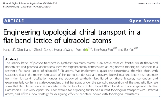 近日,太阳成集团tyc122cc潘建松研究员与浙江大学、中国科学技术大学等单位的合作者在Nature出版集团旗下顶级光学期刊《Light: Science & Applications》(中科院一区,近五年影响因子23.1)上发表了题为“Engineering topological chiral transport in a flat-band lattice of ultracold atoms”的研究论文。该研究在超冷原子实验中实现了一种基于平带局域效应的拓扑手性输运机制,为拓扑量子器件的设计提供了新思路。浙江大学李航和梁茜博士为共同第一作者,潘建松研究员与浙江大学颜波教授为共同通讯作者,中国科学技术大学易为教授为重要合作者。